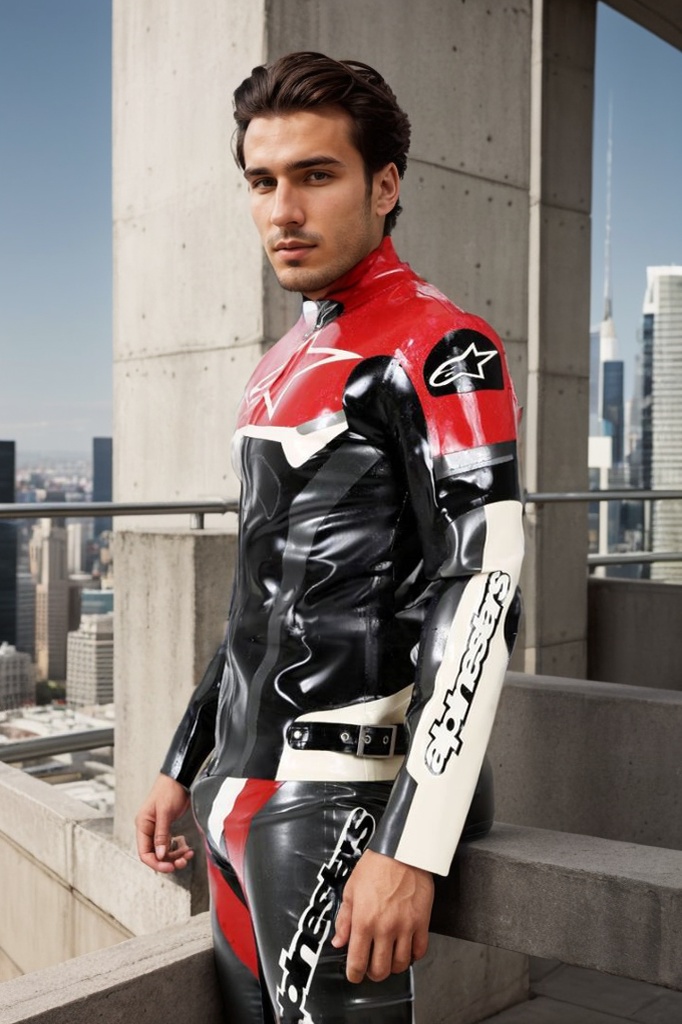 This 'Biker' jacket is expertly crafted from high-quality, high-shine 0.40 mm natural latex. Its design is a masterful blend of a sleek, sporty silhouette with modern, high-contrast details, making it a truly unique piece that projects confidence and style.